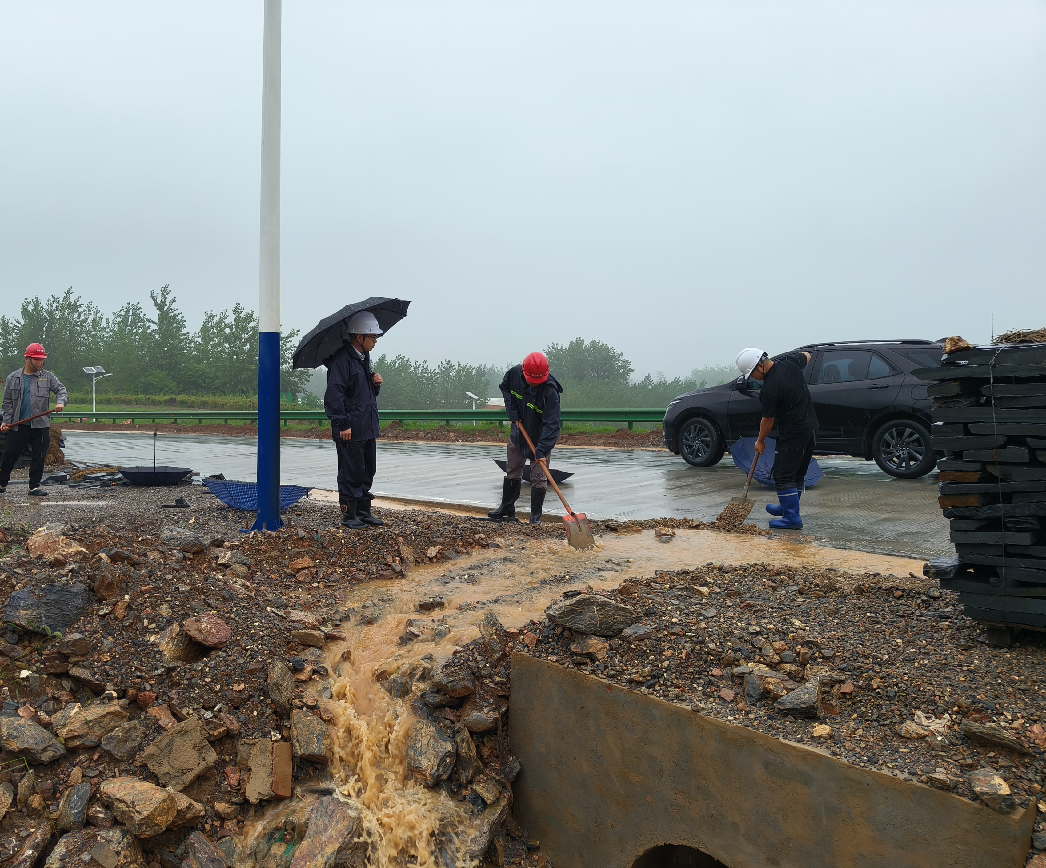 搶險現(xiàn)場,黨員干部帶頭,通過沙包筑堤、開挖排水溝等措施進(jìn)行預(yù)防,同時對礦區(qū)、加工區(qū)開展全面隱患排查。中午,水塘漫堤隱患消除。