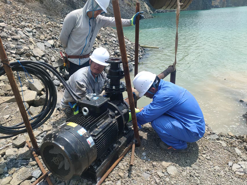抗旱方案有了,可是要想把水從70米深的礦坑內(nèi)抽到地面,不但需要揚(yáng)程特別高的水泵,還需要高規(guī)格長(zhǎng)距離的水管和電纜,還有很多配套零部件要采購(gòu)。旱情就是命令,抗旱就是責(zé)任,興天礦業(yè)副總經(jīng)理趙崗牽頭落實(shí)抗旱物資采購(gòu),親自指揮設(shè)備調(diào)運(yùn)安裝,帶領(lǐng)公司抗旱突擊隊(duì)和社區(qū)干部深入礦坑,一起研究水泵需要多大功率安裝在什么地方、水管需要多粗從哪里下放、電纜需要多長(zhǎng)從哪里接電等問題。方案制定好了,老百姓的水稻不能等,挖掘機(jī)第一時(shí)間進(jìn)場(chǎng)整理場(chǎng)地,興天礦業(yè)和社區(qū)準(zhǔn)備的水泵、水管電纜等也迅速到位,抗旱突擊隊(duì)與社區(qū)干部群眾一起與時(shí)間賽跑,從早到晚緊張施工,一心想著的就是早點(diǎn)把水抽上去,盡量把旱情影響降到最低。